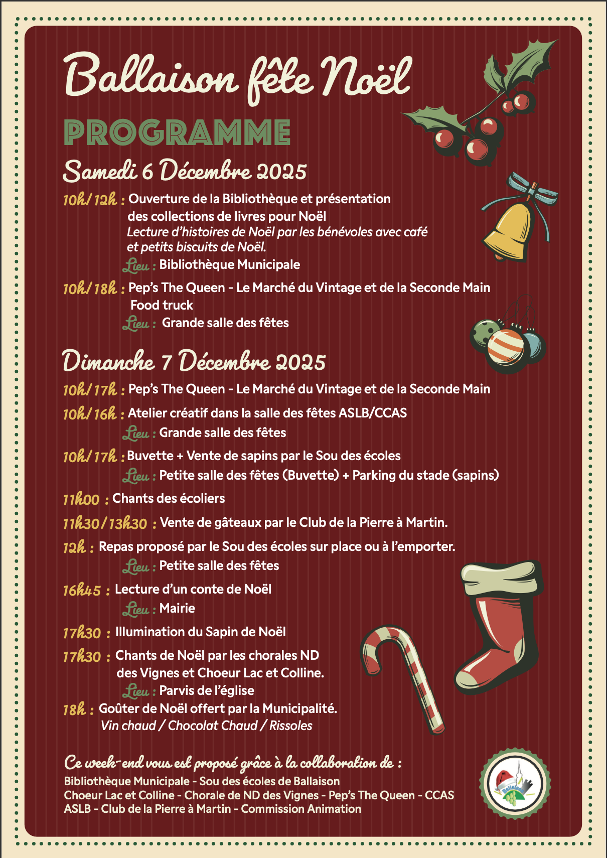 Marché, Concerts, Chants, Vente de sapins, Repas, Gourmandises, Lectures, Bricolages...