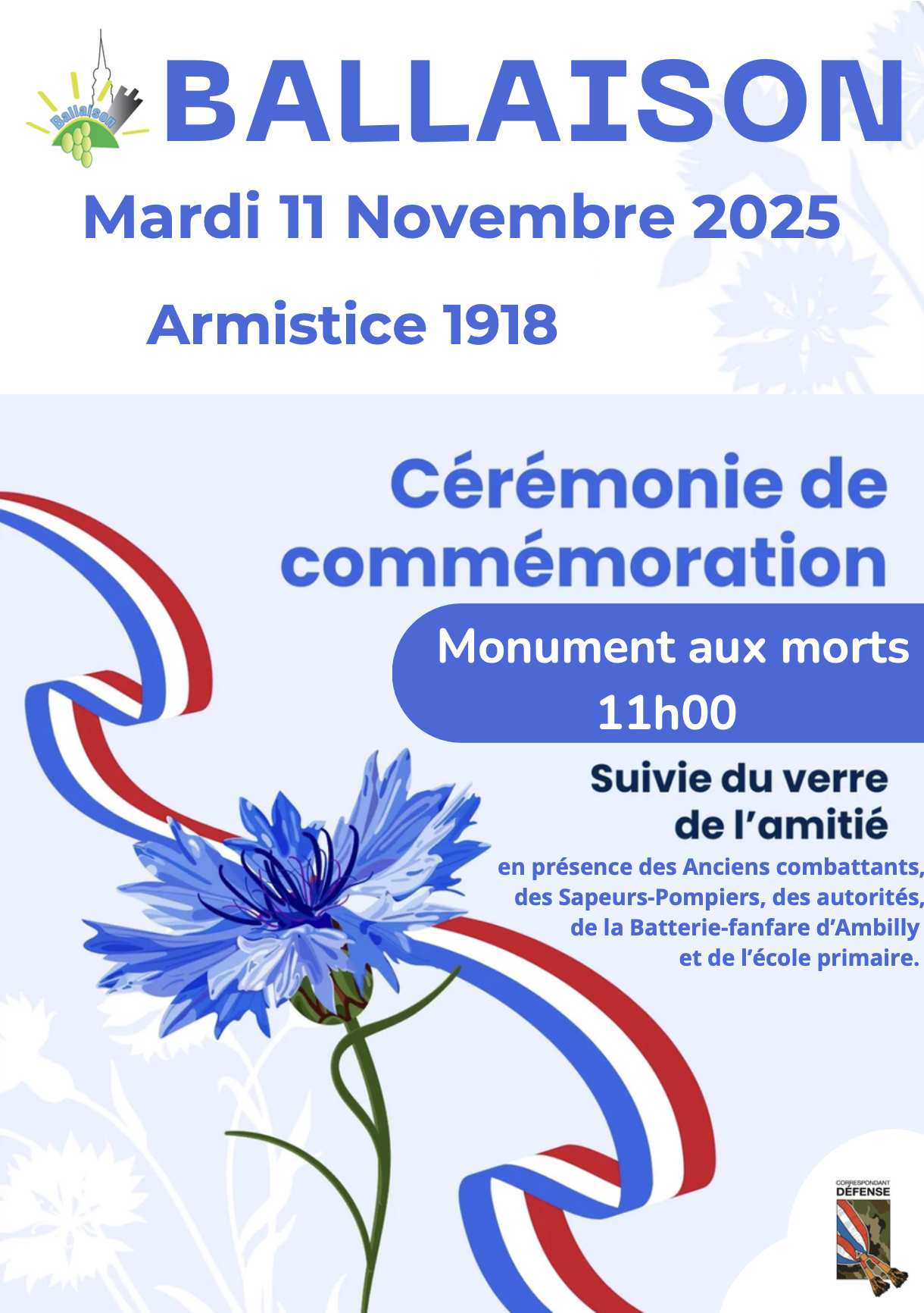 La commune de Ballaison vous invite à participer à la commémoration de l’Armistice de 1918 , le mardi 11 novembre prochain 🕊️.