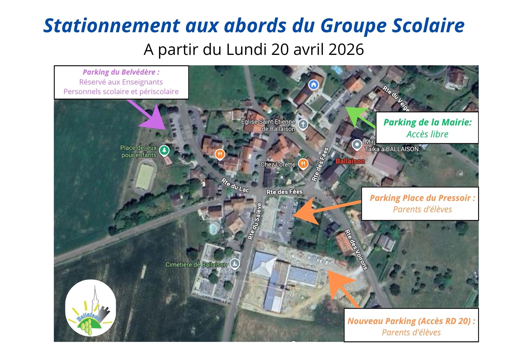 ✅ Le NOUVEAU parking (accessible depuis la Route des Voirons/RD20) ainsi que le parking de la Place du Pressoir seront dédiés aux familles pour la dépose des enfants. ⚠️ Aucun stationnement à la journée ne sera accepté.