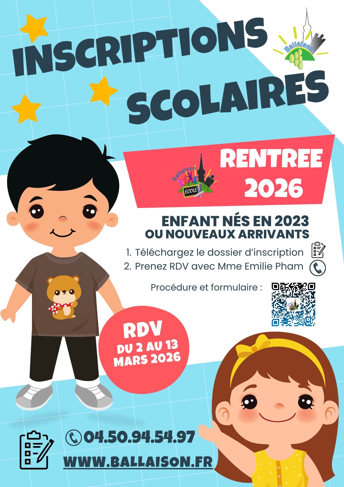 La commune de Ballaison a le plaisir d’annoncer l’ouverture des inscriptions scolaires pour l’année 2026-2027. Ces inscriptions concernent principalement les enfants nés en 2023 mais également les enfants nouvellement domiciliés sur la commune et qui souhaiteraient s’inscrire pour la rentrée prochaine via un changement d’école.