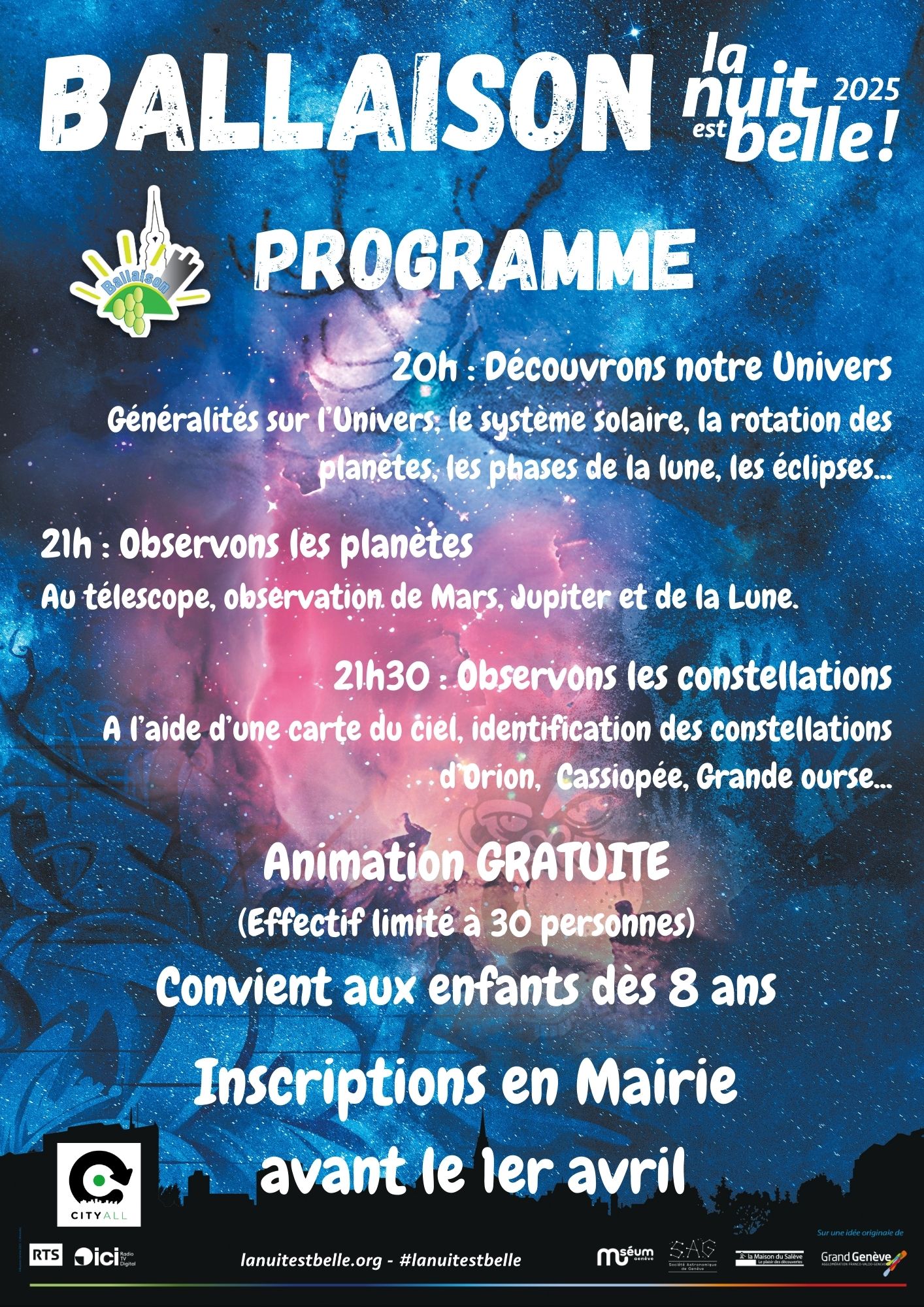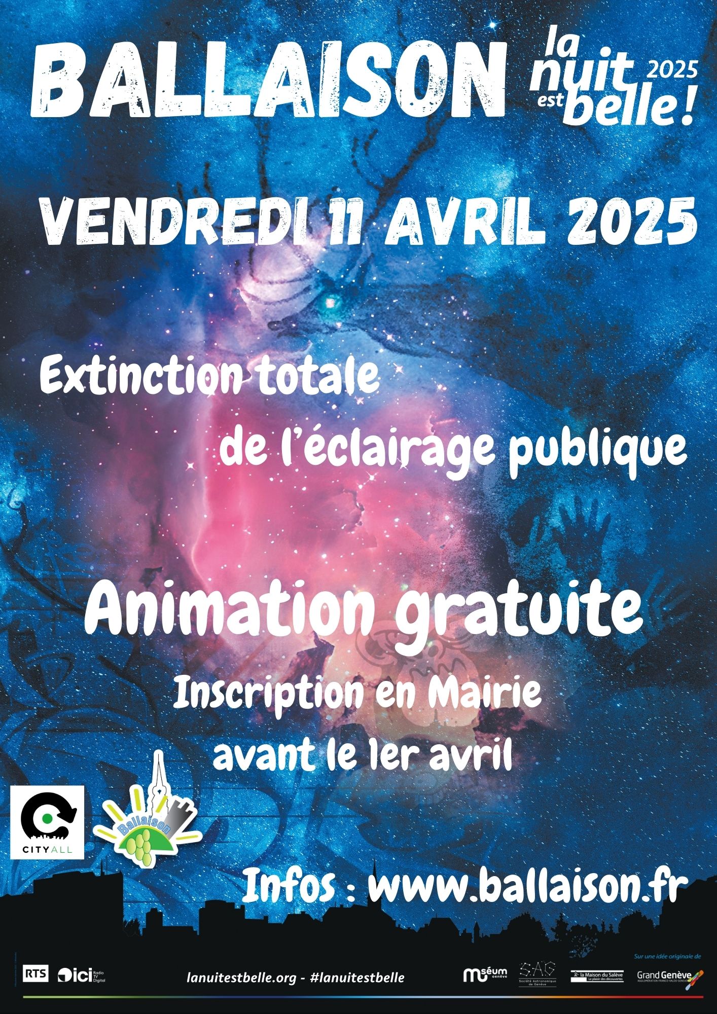 La commune de Ballaison participera ce soir à l’animation La Nuit est belle !, organisée par le Grand Genève 🌍. Fidèle à cet événement depuis sa création, Ballaison réaffirme son engagement en faveur de la préservation de l’environnement 🌱 et de la redécouverte du ciel étoilé ⭐️.